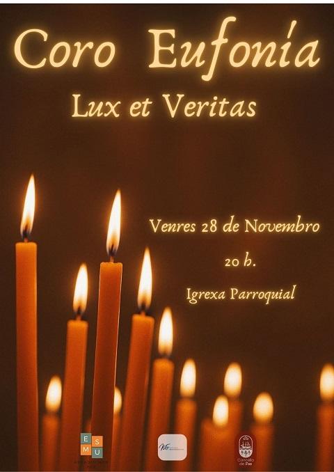 O coro Eufonía, formado na Escola Municipal de Música de Foz, actuará na igrexa parroquial focega este venres, día 28 de novembro, ás 20:00 horas. Ofrecerá un concerto titulado Lux et Veritas.