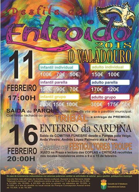 O Delegación de Cultura do Concello de O Valadouro organiza o Desfile de Entroido que se celebrará o domingo, 11 de febreiro, a partires das 17:00 horas. A saída será do Parque e percorrerá as rúas da vila para rematar no pavillón municipal onde terá lugar unha festa, amenizada polo grupo Tribal, na que se entregarán os premios do desfile.