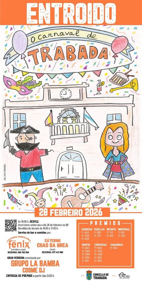 Así mesmo o Concello quixo poñer en valor o cartel anunciador desta edición, cuxo debuxo gañador é obra de Gael Díaz Fernández, agradecendo tamén a participación de todos os nenos e nenas que formaron parte do concurso de carteis do Entroido de Trabada 2026. “É unha satisfacción ver a creatividade, a ilusión e o talento da nosa infancia, que tamén forma parte activa desta festa”, sinalou o rexedor.