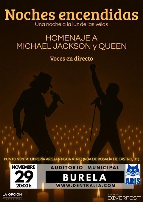 O Auditorio Municipal de Burela será o escenario do espectáculo titulado Noches Encendidas: Una noche a la luz de las velas o día 29 de novembro, sábado, ás 20:00 horas. É “un evento que renderá homenaxe a dúas das figuras máis icónicas da historia da música: Michael Jackson e Queen. O espectáculo, organizado por La Opción Producciones e Diverfest, contará con voces en directo e unha posta en escena iluminada por velas”, anuncia o Concello de Burela.