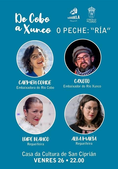 “Durante todos os venres de setembro gozamos dun festival itinerante que levou contos e historias a diferentes parroquias e locais sociais de Cervo, grazas á colaboración das asociacións veciñais e á proposta orixinal de Tarabela Creativa. Agora chega o momento da gran gala final con Carmen Conde (Embaixadora do Río Cobo), Caxoto (Embaixador do Río Xunco) e as regueifeiras Lupe Blanco e Alba María, regueifando cada unha en representación dun río. O público decidirá co seu aplauso que río gañará esta viaxe de narracións e tradición oral. O noso agradecemento a todas as persoas e colectivos que fixeron posible este mes cheo de cultura, memoria e convivencia. Non faltes, vén celebrar connosco esta noite especial!”, anuncia o Concello de Cervo.