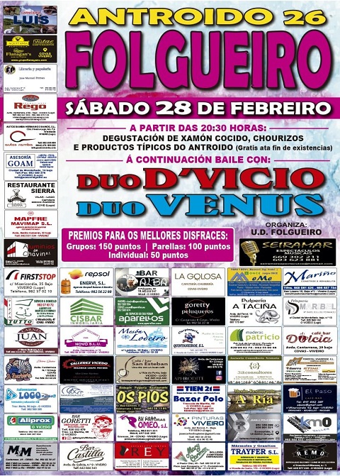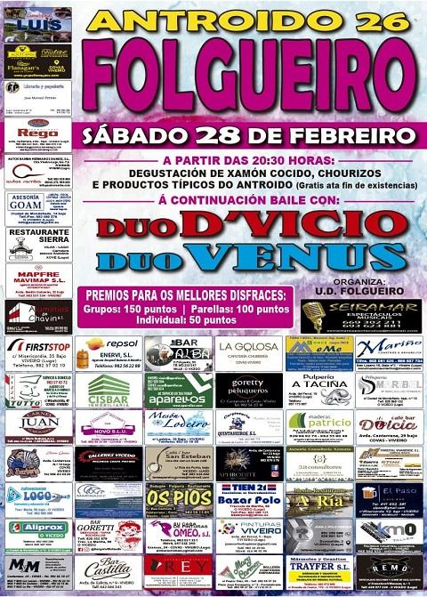 Este evento está organizado polo club de fútbol UD Folgueiro, que anuncia: “este sábado 28 de febrero celebramos o Antroido no Folgueiro por todo o alto. A partir das 20:30 horas haberá degustación de xamón cocido, chourizos e produtos típicos do Antroido (gratis ata fin de existencias). E despois, baile ata que o corpo aguante cos dúos D’Vicio e Venus. Haberá premios para os mellores disfraces: grupos, 150 puntos; parellas, 100 puntos; e individual, 50 puntos”.
