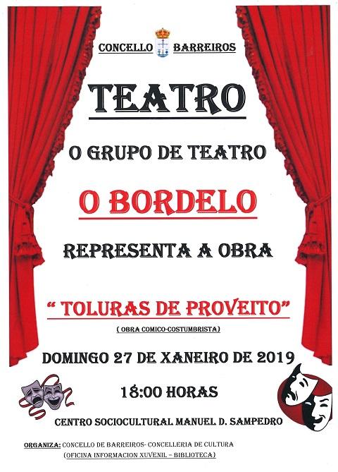 O grupo O Bordelo porá en escena a obra Toluras de proveito. Será no centro sociocultural Manuel Díaz Sampedro o domingo ás 18:00 horas.