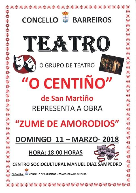 O grupo de teatro O Centiño, de San Martiño, representará a obra Zume de amorodios en San Cosme de Barreiros. Trátase dunha comedia centrada no amor, nas súas diversas idades e manifestacións.