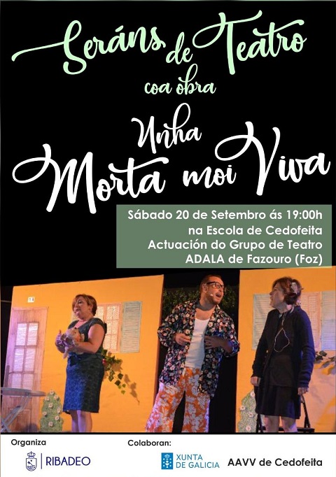 Regresan os Seráns de Teatro organizados polo Concello de Ribadeo. Este sábado, día 20 de setembro, ás 19:00 horas na Escola de Cedofeita o grupo de teatro A Adala, de Fazouro (Foz) presenta a obra titulada Unha morta moi viva.