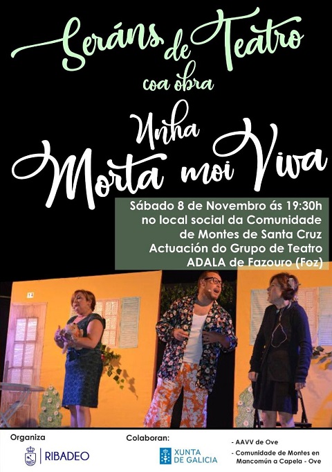 O grupo de teatro A Adala, de Fazouro (Foz), representará a obra titulada Unha morta moi viva este sábado, día 8 de novembro, ás 19:30 horas no local social da Comunidade de Montes de Santa Cruz, na parroquia ribadense de Ove.