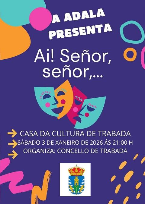 Este sábado, día 3 de xaneiro, ás 21:00 horas a Casa da Cultura de Trabada acollerá a representación teatral titulada Ai! Señor, señor,…, a cargo do grupo Adala. Esta actuación enmárcase dentro dos ciclos culturais que o Concello vén desenvolvendo de maneira regular, “apostando polo teatro e pola dinamización cultural no municipio”.
