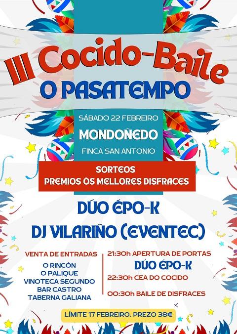 A terceira edición do Cocido Baile organizado pola asociación cultural O Pasatempo, de Mondoñedo, celebrarase o día 22 de febreiro, sábado. Serán na Finca San Antonio desde as 21:30 horas.