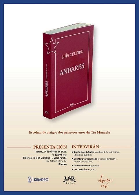 A Asociación de Periodistas e Estudosos do Camiño de Santiago (APECSA) anuncia que a presentación do libro Andares (unha escolma de artigos da sección periodística Tía Manuela), autoría do xornalista Luís Celeiro Álvarez, terá lugar o venres día 27 deste mes de febreiro ás 19:00 horas na biblioteca pública municipal El Viejo Pancho, que está na rúa Antonio Otero, 19, de Ribadeo.