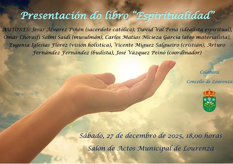 O libro titulado Espiritualidad, escrito en base a reflexións de oito persoas de orientacións relixiosas diferentes sobre o tema do espírito, presentarase en Lourenzá (no salón de actos municipal) este sábado, día 27 de decembro, ás 18:00 horas.