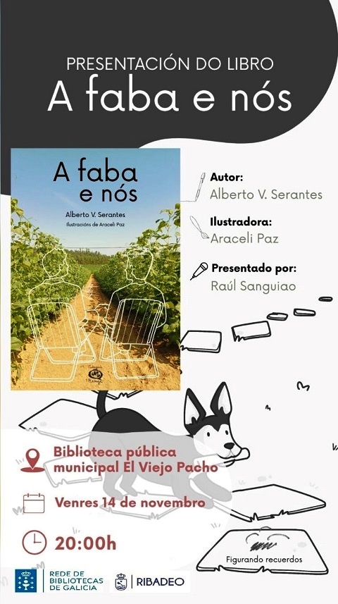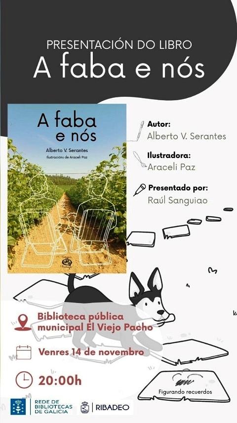Este venres, día 14 de novembro, ás 20:00 horas na Biblioteca Pública Municipal El Viejo Pancho, de Ribadeo, preséntase o libro A faba e nós, de Alberto V. Serantes, con ilustracións de Araceli Paz e presentado por Raúl Sanguiao.