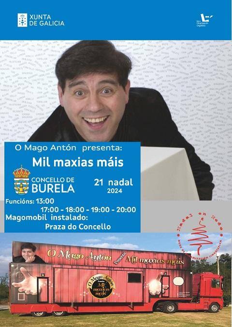 Burela acolle o espectáculo 'Mil maxias máis', do Mago Antón. Haberá funcións o sábado 21 de decembro ás 13:00, ás 17:00, ás 18:00, ás 19:00 e ás 20:00 horas.