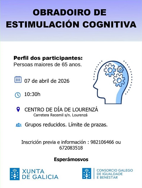 O día 7 de abril, martes, haberá un obradoiro de estimulación cognitiva para persoas maiores de 65 anos en Lourenzá. Será no Centro de Día ás 10:30 horas.