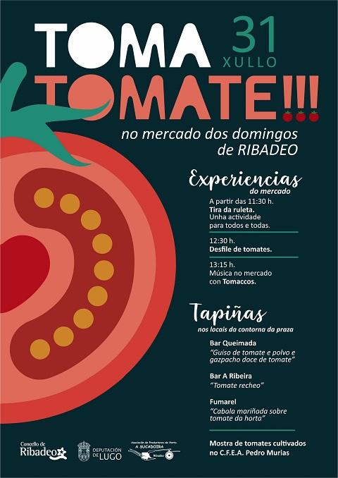 Vizoso Galdo explicou que “Toma Tomate así se chamará este evento, que terá lugar o vindeiro, 31 de xullo, no Mercado dos Domingos. Ao longo desa mañá, ademais da venda directa dos produtores e produtoras que forman parte deste mercado, terán lugar unha serie de actividades que teñen coma fío condutor o tomate. E así teremos a partir das 11.30 da mañá unha actividade de entretemento e coñecemento denominada Tira da Ruleta, que está dirixida a todos os públicos. Ás 12.30 haberá un Desfile de Tomates. Ás 13.50 contaremos con música no mercado con Tomaccos. E ao longo da mañá o Centro Pedro Murias ofrecerá unha mostra de tomates cultivados na súa finca. Ademais tamén se poderán degustar tapiñas nalgúns dos establecementos da contorna do Mercado dos Domingos”.