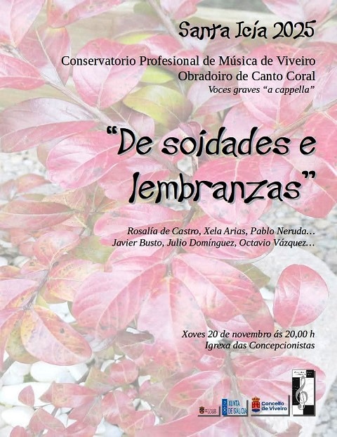 O Concello de Viveiro anuncia que o Conservatorio Profesional de Música de Viveiro “celebra a súa tradicional homenaxe á patroa da música cun fermoso concerto do Obradoiro de Canto Coral, con voces graves a cappella. De soidades e lembranzas, un percorrido musical e poético por autores como Rosalía de Castro, Xela Arias, Pablo Neruda, Javier Busto, Julio Domínguez ou Octavio Vázquez. Unha cita imperdible coa música e a emoción!”.