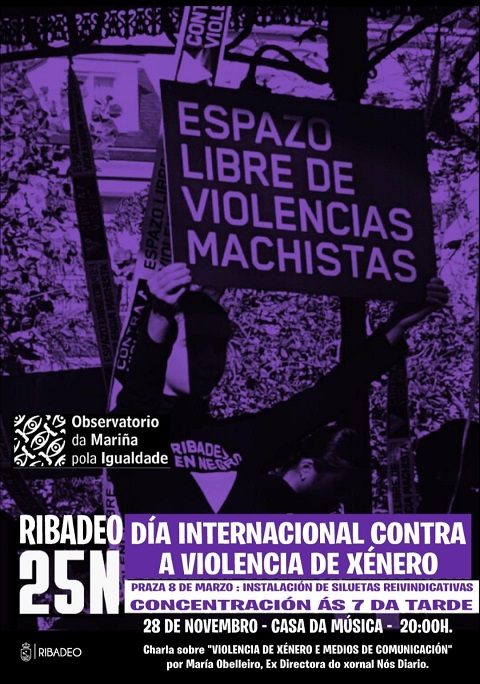 “Este 25N o Observatorio da Mariña pola Igualdade centrará os actos reivindicativos en Ribadeo: o propio día 25 colocaranse varias siluetas alusivas á violencia de xénero na praza 8 de Marzo. Para ese mesmo día e lugar, convocamos unha concentración ás 19:00 horas. O venres 28 teremos unha charla coloquio sobre Violencia de xénero e medios de comunicación, impartida por María Obelleiro, exdirectora de Nós Diario e Sermos”, anuncia o Observatorio da Mariña pola Igualdade.