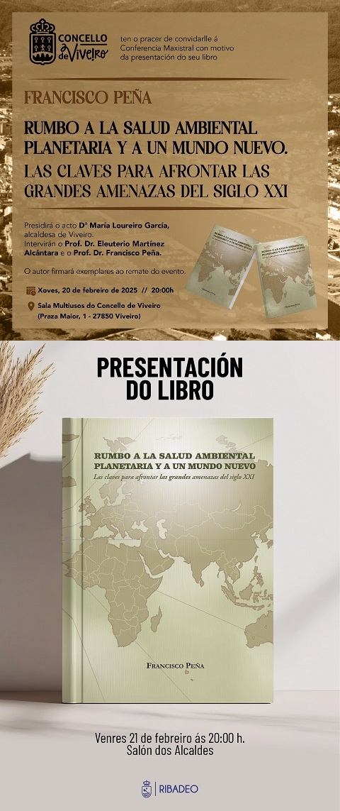 O Concello de Viveiro anuncia que “o 20 de febreiro a Sala Multiusos do Concello acollerá a presentación do novo libro de Francisco Peña, titulado Rumbo a la salud ambiental planetaria y a un mundo nuevo: Las claves para afrontar las grandes amenazas del siglo XXI, unha obra que afonda na relación entre o medio ambiente e a saúde, temática na que o autor é un dos grandes referentes. Presidirá o acto a alcaldesa, María Loureiro García, e no evento o profesor Eleuterio Martínez Alcántara, científico de prestixio en América, intervirá por videoconferencia tras presentar a obra. Ademais o profesor Francisco Peña analizará o contido dos cinco capítulos que conforman o libro. Ao rematar o autor asinará exemplares”.