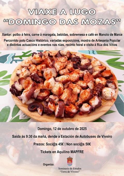 O Seminario de Estudos Terra de Viveiro organiza unha viaxe a Lugo para o día 12 de outubro, Domingo das Mozas. A saída será ás 9:30 da mañá dende a Estación de Autobuses de Viveiro.