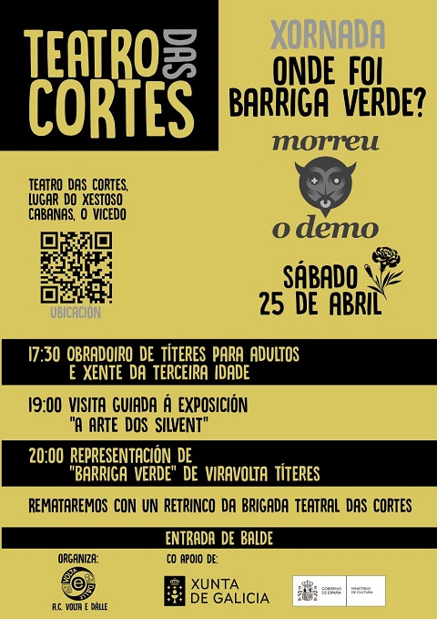 Entre as primeiras propostas do programa atópase a xornada Onde foi Barriga Verde? que se celebrará no propio Teatro das Cortes este sábado, día 25 de abril, e que inclúe a exposición titulada A arte dos Silvent, un obradoiro de creación de monicreques para persoas adultas, unha representación de Barriga Verde a cargo de Viravolta Títeres e máis un retrinco da Brigada Teatral das Cortes sobre o 25 abril portugués. Todas as actividades serán de balde. Para se inscribir no obradoiro cómpre apuntarse en voltaedalle@gmail.com.