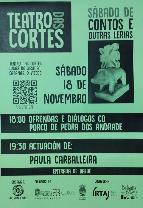 O Teatro das Cortes, que está no lugar de Xestoso, en Cabanas (O Vicedo) organiza un Sábado de Contos e outras Leiras para o 18 de novembro a partir das 18:00 horas. A entrada é de balde.
