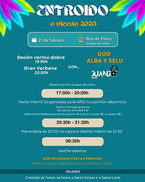 Este evento está organizado pola comisión de festas na honra a Santo Estevo e a Santa Lucía, que anuncia: “nesta ocasión celebramos o Entroido coas actuacións dos grandísimos artistas dúo Alba y Selu e Juanjo Music , que estarán con nós tanto na sesión vermú dobre coma na gran verbena. Coma sempre, haberá festa infantil organizada pola APA e, deseguido, merendola na carpa. Tamén contaremos co tradicional desfile tanto infantil coma adulto, cos seus respectivos premios aos mellores disfraces”.