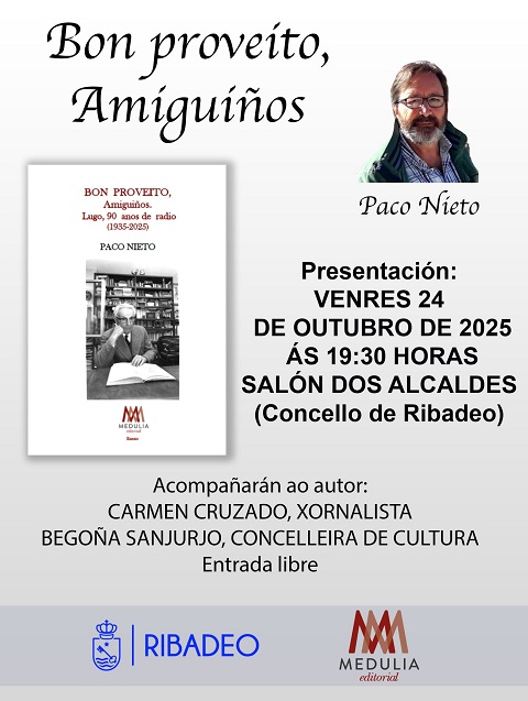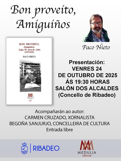 O xornalista lugués Paco Nieto presentará en Ribadeo o seu libro titulado Bo proveito, amiguiños. Lugo, 90 anos de radio. Será o 24 de outubro no Salón dos Alcaldes do Concello ás 19:30 horas.