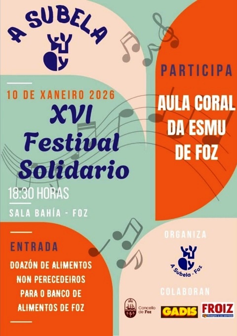 A Subela anuncia que contará coa participación da Aula Coral da Escola Municipal de Música de Foz e que a entrada para asistir consiste na doazón de alimentos non perecedoiros para o Banco de Alimentos de Foz.