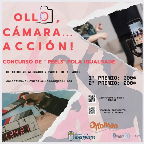 "Ollo, cámara... Acción: reels pola igualdade" é o nome do certame que vén de convocar o Colectivo Cultural Ollomao, de Barreiros, cuxo eixo temático central e principal cuestión a reivindicar é a igualdade real e efectiva entre as persoas de diferente xénero.