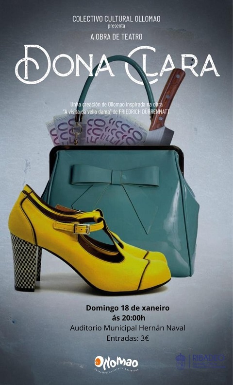 O Colectivo Cultural Ollomao, de Barreiros, representará en Ribadeo a obra teatral Dona Clara, inspirada en A visita da vella dama, de Friedrich Dürrenmatt. Será este domingo, día 18 de xaneiro, ás 20:00 horas no Auditorio Municipal Hernán Naval.