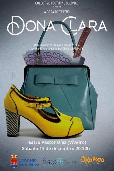 O grupo teatral do Colectivo Cultural Ollomao, de Barreiros, representará en Viveiro a obra titulada Dona Clara. Será este sábado, día 13 de decembro, no Teatro Pastor Díaz ás 20:30 horas. É unha actuación incluída no Circuíto de Teatro Afeccionado da Vicepresidencia da Deputación de Lugo. A entrada é de balde ata completar aforo e non é necesario facer reserva previa.