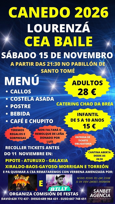 A comisión das festas de Canedo, no municipio de Lourenzá, de 2026 organiza unha cea baile para recadar fondos destinados aos festexos. Será o 15 de novembro, sábado, no pavillón de Santo Tomé desde as 21:30 horas.