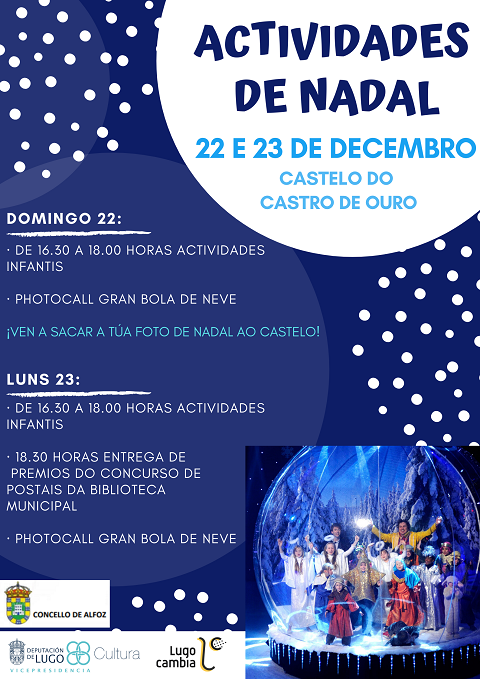 O Concello de Alfoz organiza distintas actividades de Nadal dentro do programa ‘Nadal en Igualdade’ durante o domingo 22 e luns 23 de decembro no Castelo do Castro de Ouro. Dende as 16.30 horas ata as 18.00 horas haberá actividades infantís para nenos e nenas de distintas idades, onde realizarán xogos e obradoiros creativos, como por exemplo un obradoiro de ilustracións de contos que terá lugar o domingo 22.