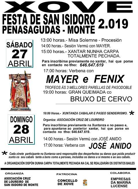 O sábado, día 27, ás 13:00 horas, terá lugar a misa solemne na igrexa parroquial e procesión en honra a San Isidoro. Ás 14:00 horas, haberá sesión vermú con Mayer, e ás 15:00 horas, celebrarase un xantar (para inscribirse previamente hai que chamar ao teléfono 646 647 619).