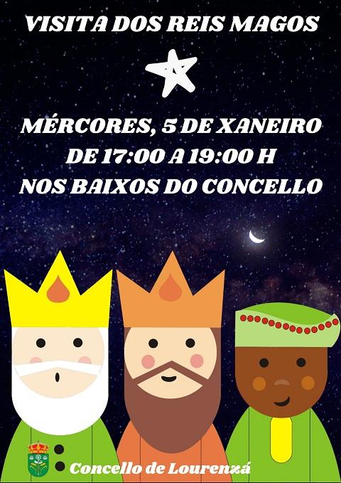Os Reis Magos visitarán Lourenzá mañá, mércores, e recibirán @s nen@s nso baixos da Casa do Concello de 17 a 19 horas. Pero non se fará cabalgata, debido á situación na que se atopa a pandemia de Covid, segundo explica o concelleiro de Cultura, Manuel Arango Ron.