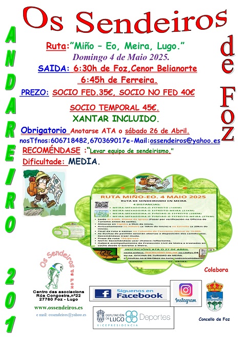 A asociación Os Sendeiros, de Foz, fará o domingo 4 de maio a ruta Miño-Eo, no municipio de Meira. A saída desde Foz será ás 06:30 horas e ás 06:45 horas desde Ferreira do Valadouro.
