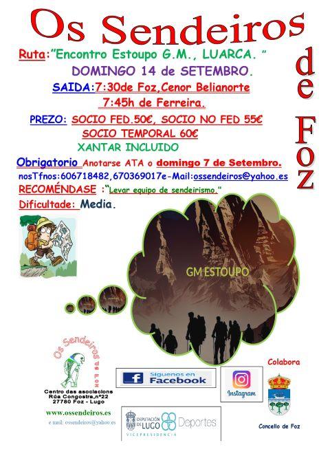 A asociación Os Sendeiros de Foz organiza o 14 de setembro unha saída especial a Luarca para participar no Encontro dos Amigos do Club de Luarca G. M. Estoupo, que celebra o seu aniversario.