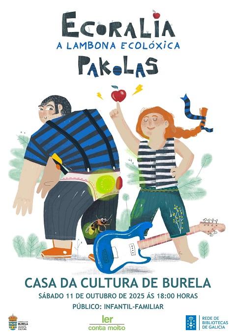 O Concello anuncia que “Ecoralia, a lambona ecolóxica chega a Burela. Este sábado, 11 de outubro, a Casa da Cultura convértese nun espazo de música e maxia da man de Pakolas. Contaremos e cantaremos a historia de Ecoralia, unha meiga ecolóxica que nos ensinará, a través das cancións, a importancia de consumir alimentos ecolóxicos, coidar o medio ambiente, combater o cambio climático e garantir o benestar animal”.