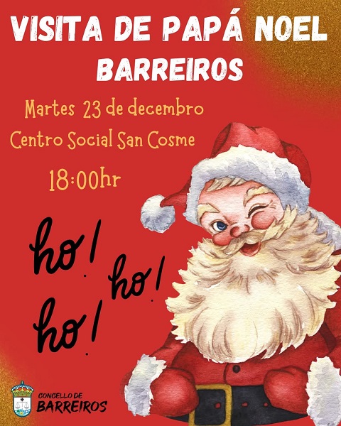 O Concello de Barreiros anuncia que “Papá Noel chama á porta e quere falar coas nenas e nenos de Barreiros. Cóntanos que estará o martes 23 de decembro no centro sociocultural de San Cosme a partir das seis da tarde. Seica vén con moitas ganas de saudar á cativada e ás súas familias, así que animámosvos a achegarvos a este encontro tan especial e agardado do Nadal”.