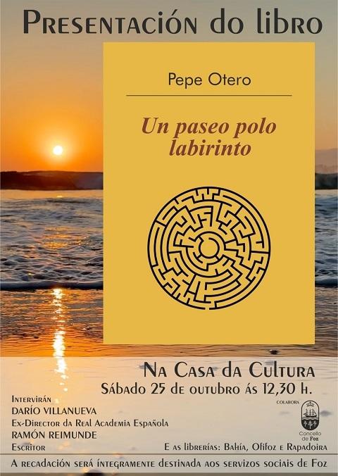 A concelleira de Cultura, Inés López Couto, anuncia que o profesor Pepe Otero presentará este sábado, día 25 de outubro, o seu novo libro, titulado Un paseo polo labirinto. Será no salón de actos da Casa da Cultura de Foz ás 12.30 horas.