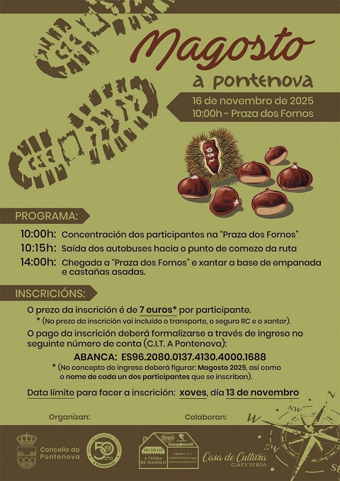 Este domingo, día 16 de novembro, a Praza dos Fornos, na Pontenova, acollerá un magosto con ruta de sendeirismo. A actividade está organizada polo Concello e o Centro de Iniciativas Turísticas (CIT).