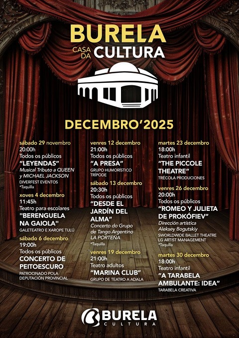 O Concello de Burela anuncia a programación da Casa da Cultura ata final de ano, que comezará este sábado, 29 de novembro, ás 20:00 horas co musical tributo a Queen e Michael Jackson titulado Leyendas. Ademais deste musical de Diverfest eventos, apto para todos os públicos, haberá representacións teatrais, concertos, espectáculos humorísticos e moito máis ata o día 30 de decembro.