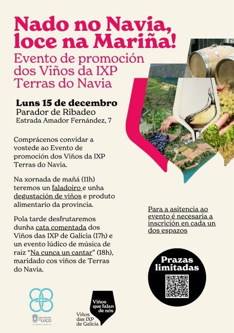 Ribadeo acollerá o vindeiro luns, 15 de decembro, un evento de promoción dos Viños da IXP Terras do Navia. Será no Parador de Turismo en horario de mañá e de tarde.
