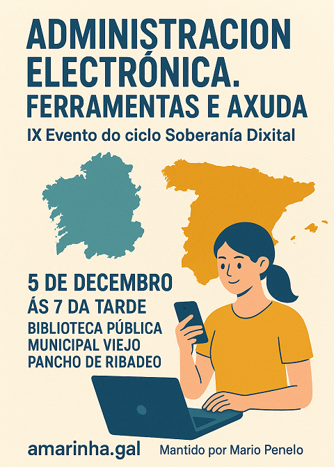 O venres 5 de decembro ás sete da tarde a Biblioteca Pública Municipal El Viejo Pancho de Ribadeo (rúa Antonio Otero, 19), acollerá o evento titulado Soberanía Dixital IX: Administración electrónica. Ferramentas e axuda.