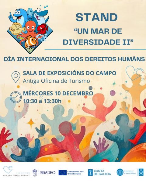O próximo mércores, 10 de decembro, coincidindo co Día Internacional dos Dereitos Humanos, Ribadeo contará cun espazo especial dedicado á diversidade, á empatía e á inclusión. A Asociación Guillem Veiga Iglesias instalará na sala de exposicións do Campo o stand Un Mar de Diversidade II, unha proposta aberta para que a cidadanía poida reflexionar e experimentar sobre como se constrúe unha sociedade máis xusta e accesible para todas as persoas.