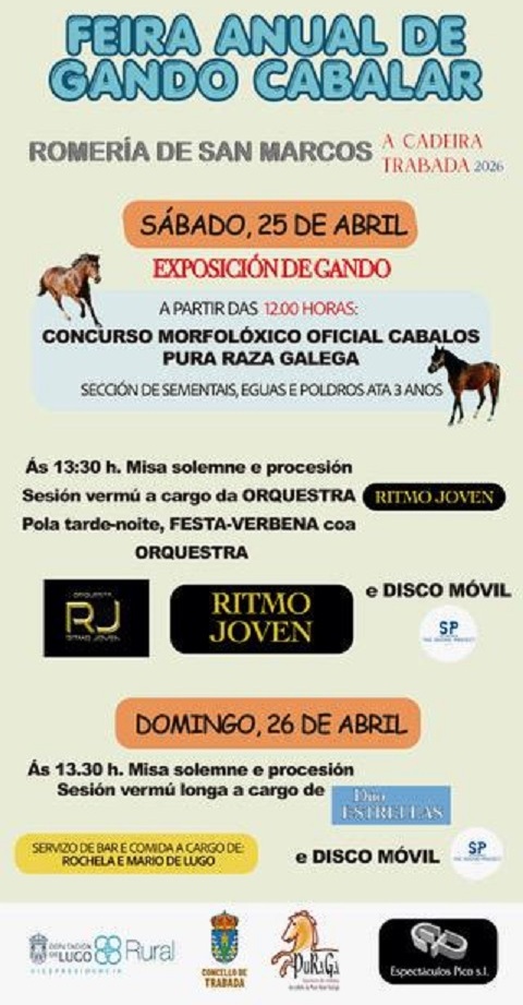Trabada acollerá os días 25 e 26 de abril, sábado e domingo, unha nova edición da romaría de San Marcos, “unha das festas e feiras máis emblemáticas e con maior tradición do municipio, que terá lugar na área recreativa da A Cadeira”, anuncia o Concello de Trabada.