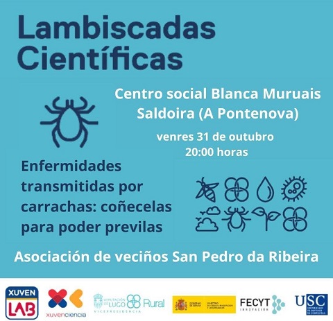 Dentro do programa Lambiscadas Científicas, o centro social Blanca Muruais, de Saldoira (A Pontenova), acollerá unha charla titulada Enfermidades transmitidas por carrachas: coñecelas para poder previlas. Será este venres, día 31 de outubro 20:00 horas.