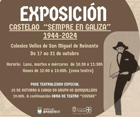 Os colexios vellos de San Miguel de Reinante (Barreiros) acollerán do 17 ao 31 de outubro unha exposición que recolle a actividade política e literaria de Castelao desde o ano 1934, cando firma os seus primeiros artigos no desterro estremeño, ata 1944, ano da publicación da primeira edición de Sempre en Galiza e da fundación do Consello de Galiza, goberno galego no exilio do que precisamente Castelao foi o primeiro presidente, anuncia o Concello de Barreiros.