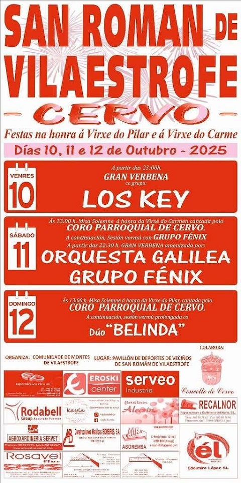 O Concello de Cervo convida á veciñanza e visitantes a participar nas festas de San Román de Vilaestrofe, que terán lugar no pavillón de deportes da parroquia entre o venres 10 e o domingo 12 de outubro. As celebracións foron presentadas pola tenente de alcaldesa Mali Méndez; polo edil de Zona Rural, Adrián Arias; e por representantes da Comunidade de Montes de Vilaestrofe, entidade organizadora das festas coa colaboración do Concello.