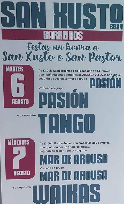 A parroquia de San Xusto, no concello de Barreiros, celebrará as súas festas patronais na honra a San Xusto e San Pastor, os días 6 e 7 de agosto, martes e mércores.