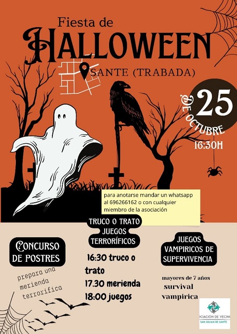 La asociación de vecinos San Julián de Sante, en el municipio de Trabada, organiza una fiesta infantil de Halloween para este sábado, día 25 de octubre, desde las 16:30 horas.